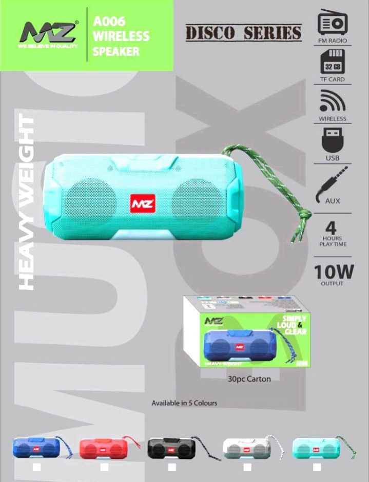 The MZ A006 Bluetooth Speaker is a compact and versatile audio device designed for a convenient and enjoyable music experience. With Bluetooth connectivity, this speaker effortlessly pairs with your devices, providing a wireless and hassle-free audio solution. The A006 delivers clear and vibrant sound, making it suitable for various settings. Its sleek design adds a touch of modernity, and the built-in rechargeable battery ensures extended playtime for on-the-go use. Compact and lightweight, this speaker is easy to carry, making it an ideal choice for those who value both portability and quality sound in their audio accessories. Elevate your mobile audio experience with the MZ A006 Bluetooth Speaker.