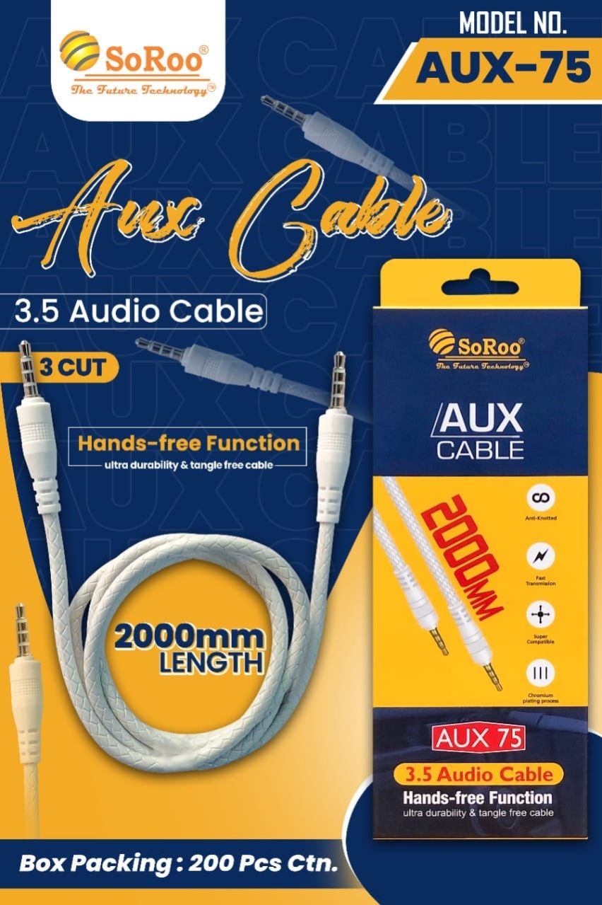 The G SoRoo AUX-75 2 Meter AUX Cable is a versatile and reliable audio accessory designed for connecting your devices to external speakers, headphones, or car stereos. With an extended length of 2 meters, this AUX cable provides flexibility and convenience for connecting devices without compromising audio quality. The AUX-75 model features a durable build with high-quality connectors, ensuring a stable and clear audio transmission. Whether you're enjoying music in your car, connecting to external speakers, or using headphones, the G SoRoo AUX-75 2 Meter AUX Cable is a practical solution for enhancing your audio experience with reliable and extended connectivity.