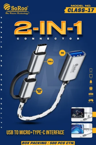 The SoRoo Class-17 2-in-1 OTG (On-The-Go) is a versatile and compact accessory designed to enable USB On-The-Go functionality for devices with both Type-C and V8 ports. With a reliable and durable design, this OTG adapter allows you to connect USB peripherals such as flash drives, keyboards, or mice directly to your Type-C or V8 port-equipped device. The Class-17 model ensures seamless data transfer and convenient connectivity for a variety of USB accessories, offering flexibility for devices with different port types. Whether you want to expand your device's functionality or easily transfer data on the go, the SoRoo Class-17 2-in-1 OTG is a practical solution for enhancing the capabilities of your devices.