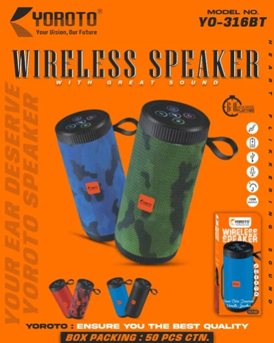 The Yoroto YO-316BT Bluetooth Speaker is a portable audio device designed to deliver a versatile and enjoyable listening experience. With Bluetooth connectivity, this speaker effortlessly pairs with your devices, providing a wireless and convenient audio solution. Despite its compact size, the YO-316BT produces clear and dynamic sound, making it suitable for various environments. The sleek and modern design adds a touch of style to any setting, and the built-in rechargeable battery ensures extended playtime for on-the-go use. The Yoroto YO-316BT Bluetooth Speaker is an ideal choice for those who value both portability and quality sound in their audio accessories.